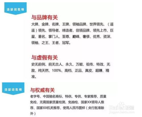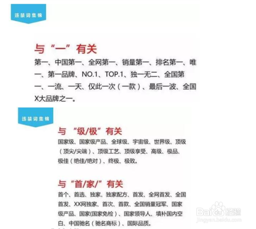 1、《广告法》及监管部门明令禁止使用的:最高级、国家级、最佳、顶级、极品、第一品牌;